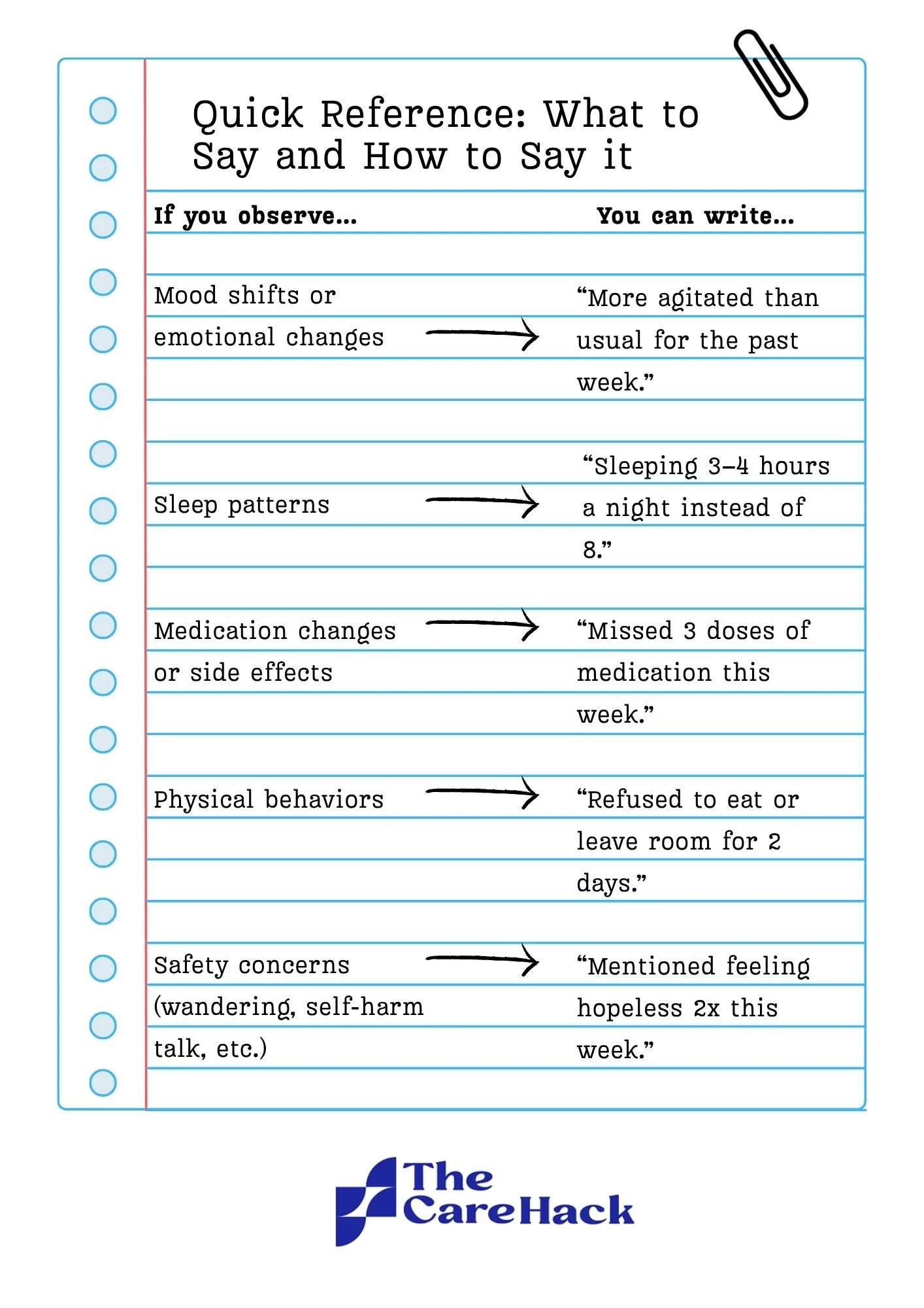 Jot down changes in mood, sleep, behavior, or medication as they happen. The goal isn’t to write a long story—it’s to create a clear, useful snapshot of what’s going on. Stick to the facts, focus on patterns, and highlight any turning points.
