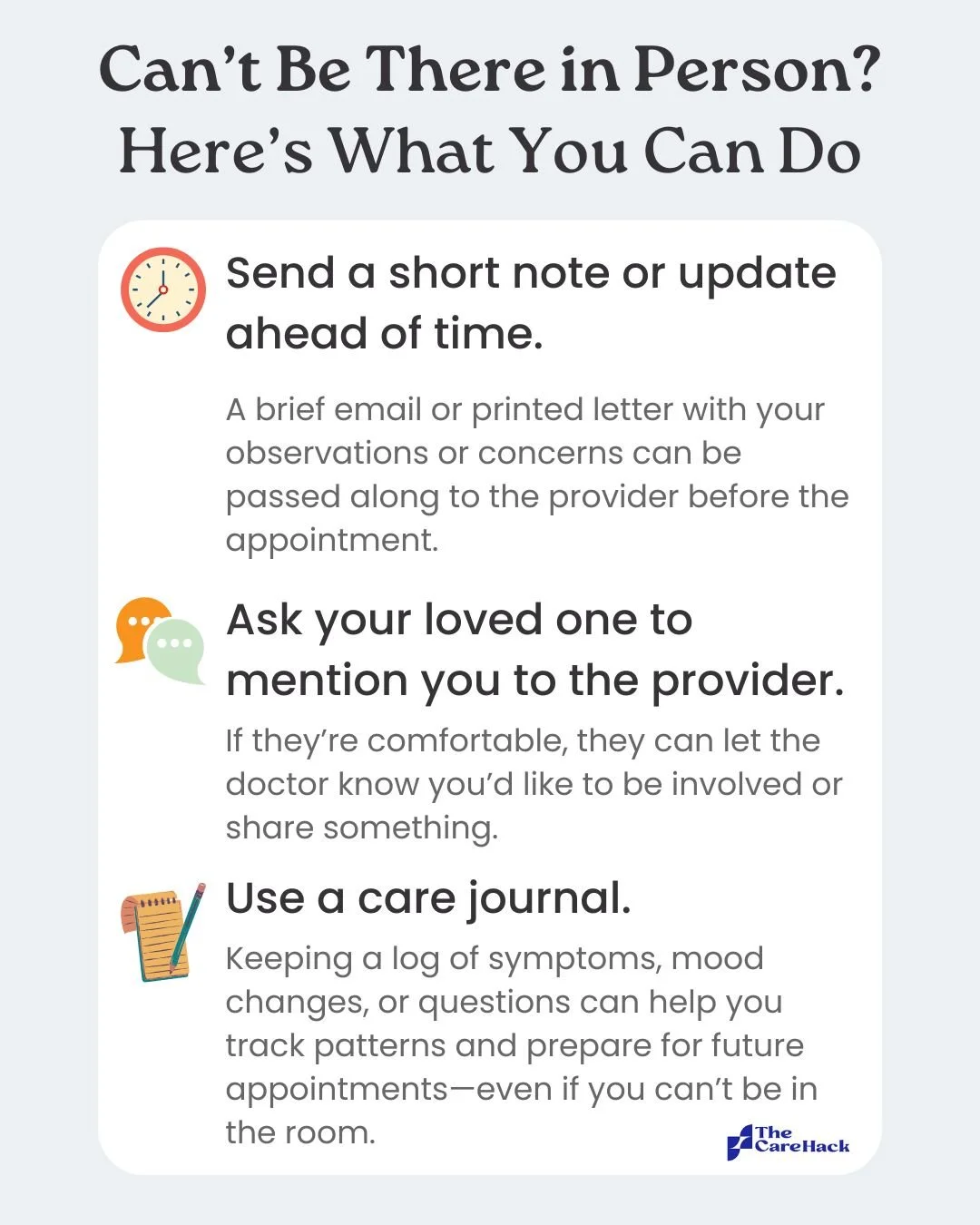 Use that to your advantage. You see your loved one every day. You notice the changes, the warning signs, and the subtle shifts that may not show up in a short appointment. Even if your loved one hasn’t given the provider permission to talk with you, you can still speak up.